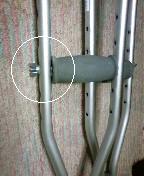 ちょっと見にくいと思うのですが、松葉杖を持つ時は、写真の白丸がついている蝶ボルトを必ず前側に来るように持ちます。
